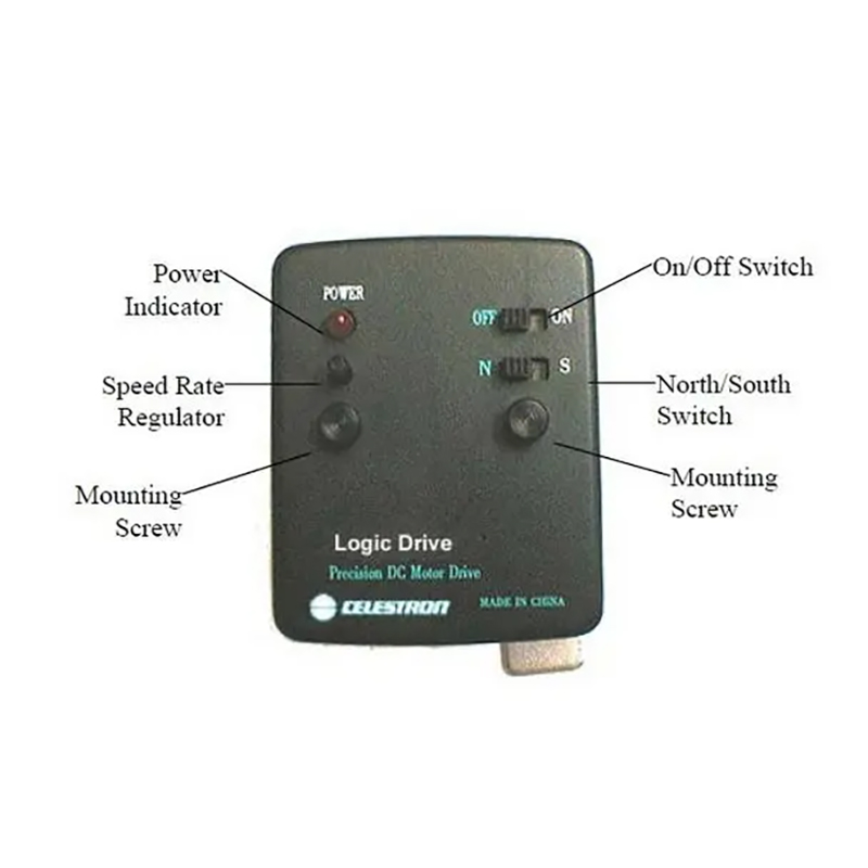 موتور محور بُعد تلسکوپ سلتسترون با باتری 9 ولتی کار می کند، بنابراین هیچ سیمی ایجاد مانع نمی کند. موتور را می توان در نیمکره شمالی یا جنوبی استفاده کرد. برای تغییر نیمکره ها (معکوس کردن جهت موتور)، به سادگی کلید شمال/جنوبی (N/S) را روی صفحه درایو موتور بچرخانید.